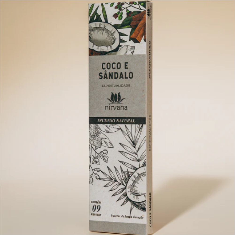 Contém: Blend terapêutico Nirvana (mix de resinas naturais, ervas, óleos essenciais e especiarias), varetas de bambu, pó de madeira, aglutinante, fragrância de coco e sandalo.